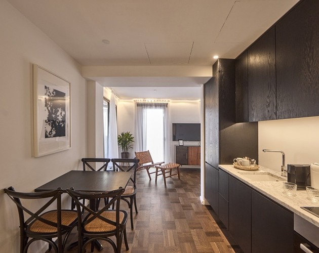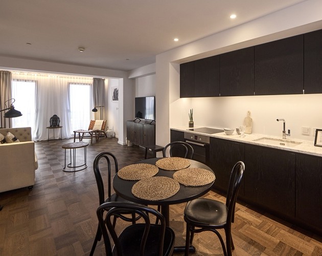 La cocina completamente equipada incluye vitrocerámica, horno, microondas, nevera, congelador y comedor para cuatro personas. Disfruta además del balcón privado para relajarte durante tu estancia.
