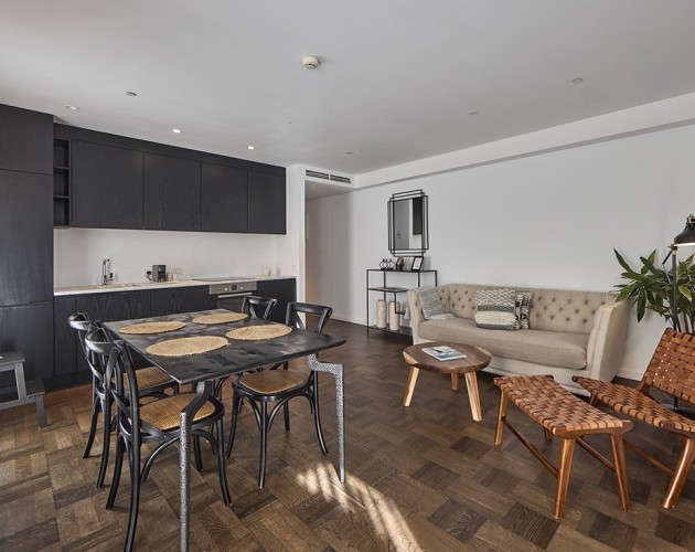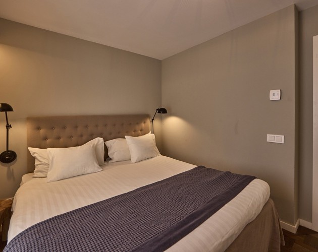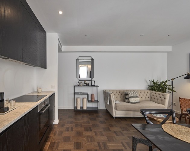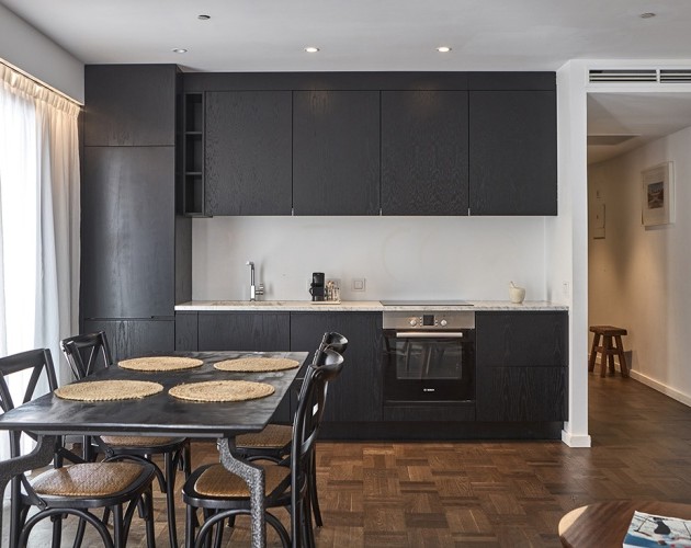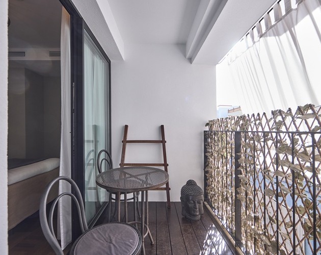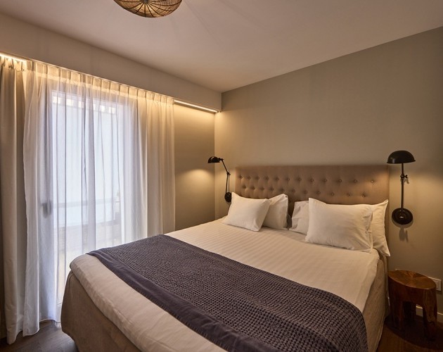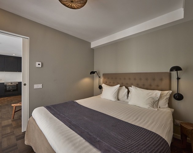 El salón diáfano dispone de un balcón privado y sofá cama (140 cm), que permite el acomodamiento de una tercera pareja adicional o dos niños. La cocina equipada incluye placa de inducción, horno con aire caliente, microondas, nevera, congelador, cafetera Nespresso, tostadora, hervidor eléctrico y comedor para cuatro personas.
