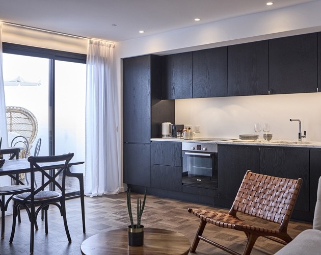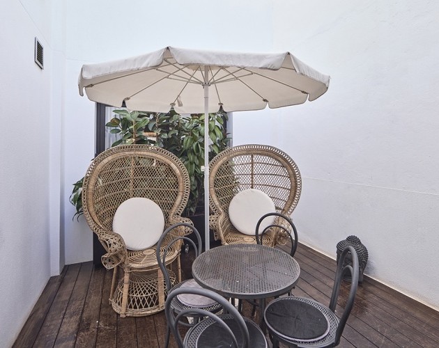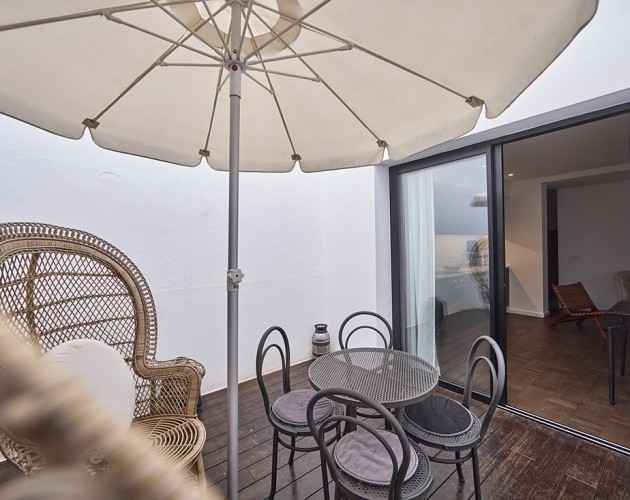 La primera planta tiene un diseño abierto con acceso directo a un acogedor patio privado, ideal para desayunar o relajarse al aire libre. La cocina está equipada con placa de inducción, horno, microondas, nevera, congelador y comedor para 4 personas.